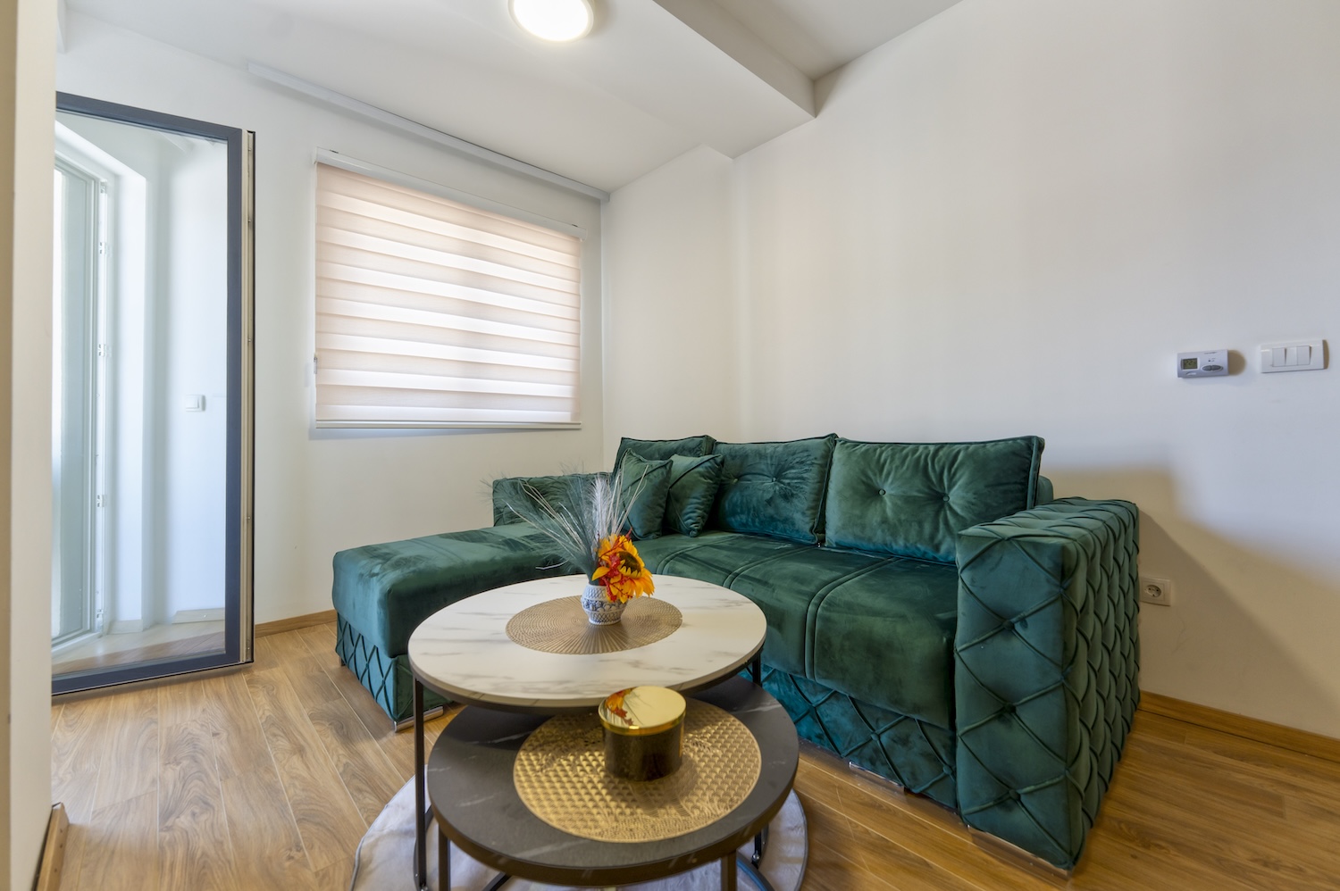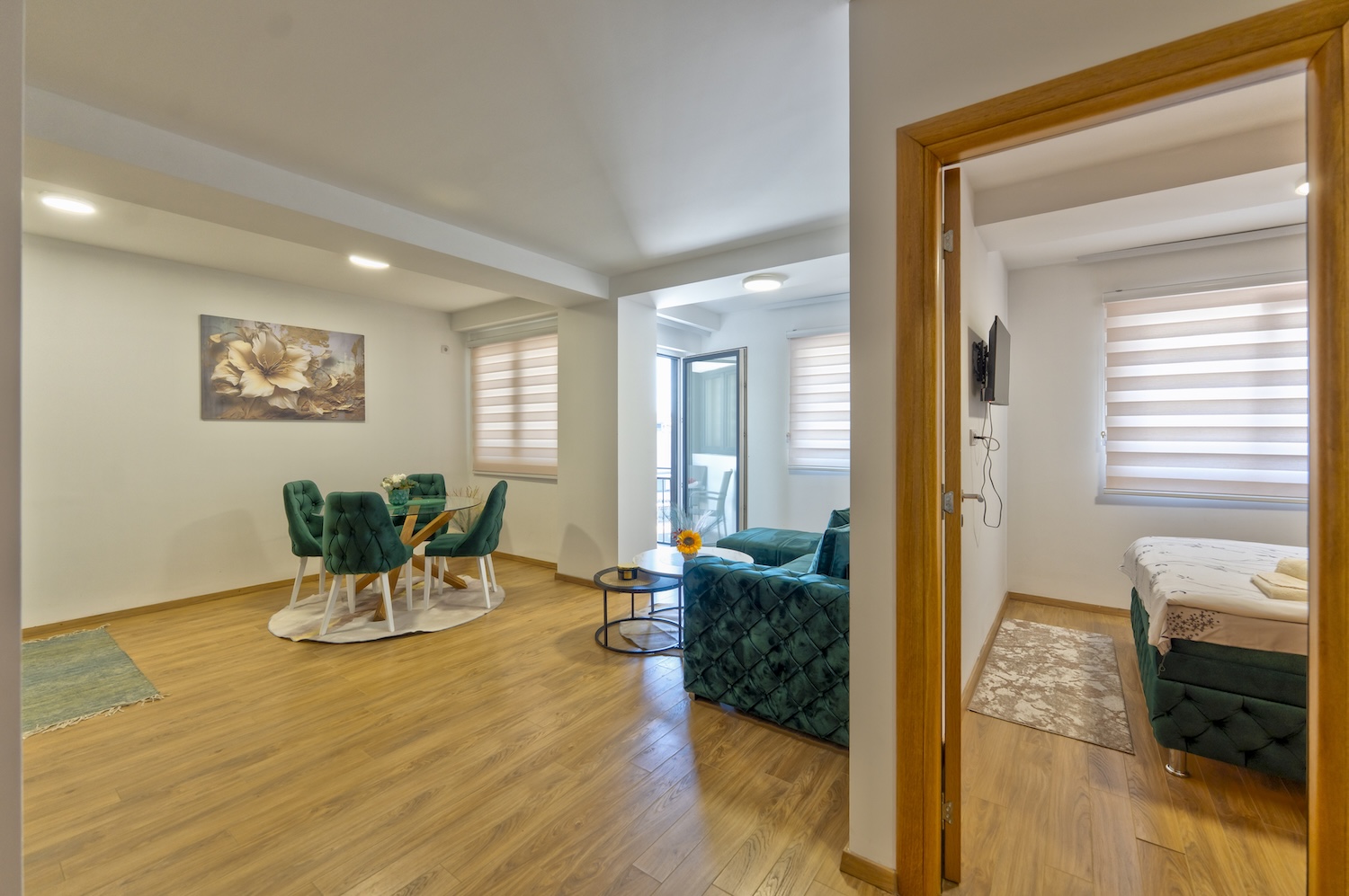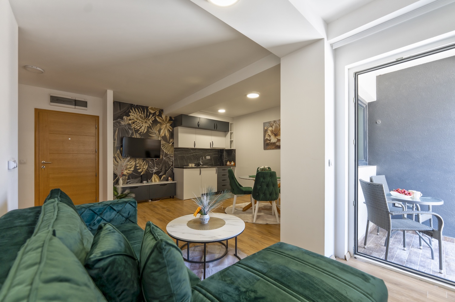 Apartman je luksuzno opremljen i potpuno nov, ima zasebnu spavaću sobu i veličine je 45m2, terasu sa predivnim pogledom, poseduje internet konekciju, kao i kablovsku TV. Pogodan je za smeštaj do 4 osobe. Kuhinja je potpuno opremljena. Gostima su obezbeđeni peškiri i posteljina.