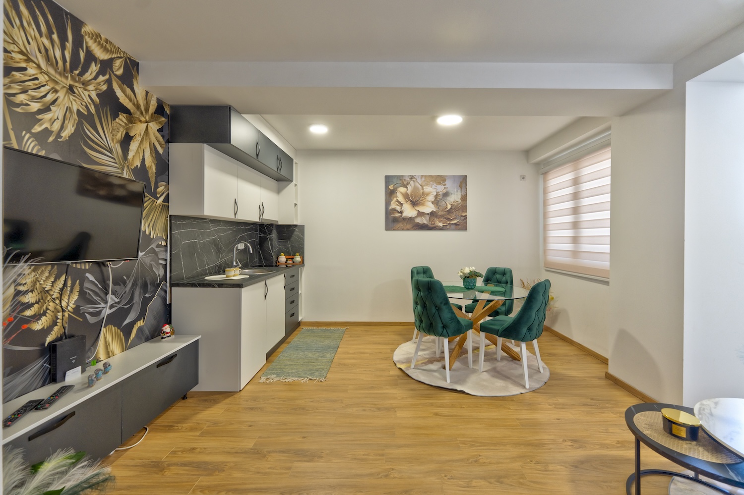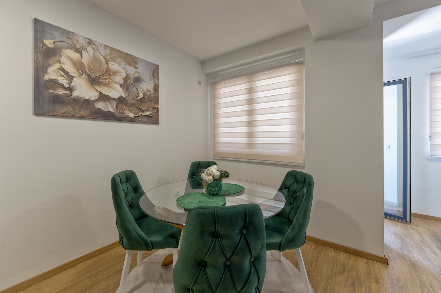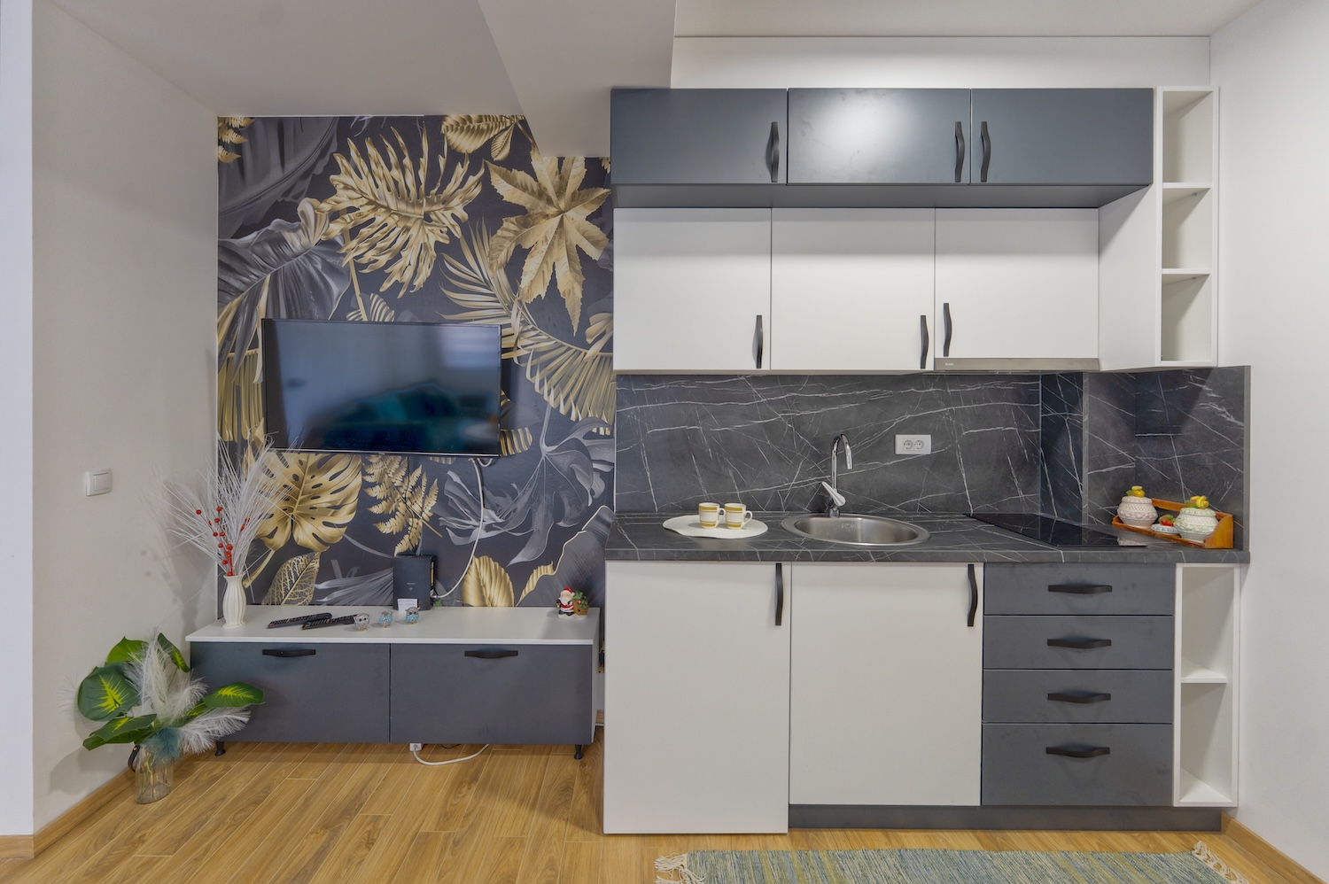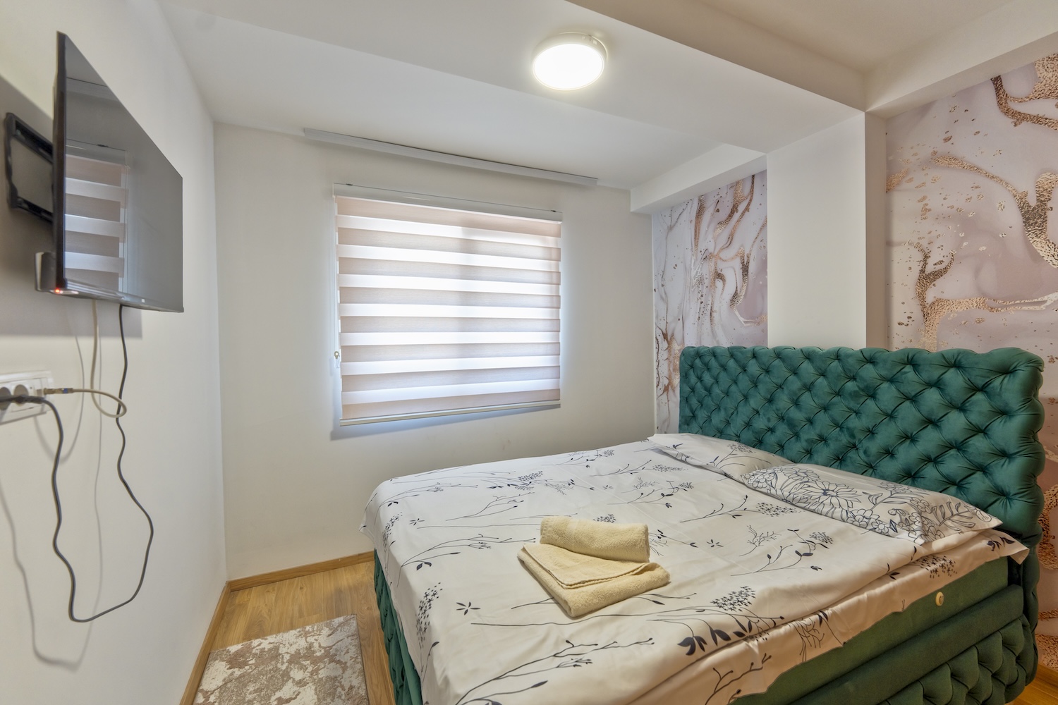 Apartman je luksuzno opremljen i potpuno nov, ima zasebnu spavaću sobu i veličine je 45m2, terasu sa predivnim pogledom, poseduje internet konekciju, kao i kablovsku TV. Pogodan je za smeštaj do 4 osobe. Kuhinja je potpuno opremljena. Gostima su obezbeđeni peškiri i posteljina.