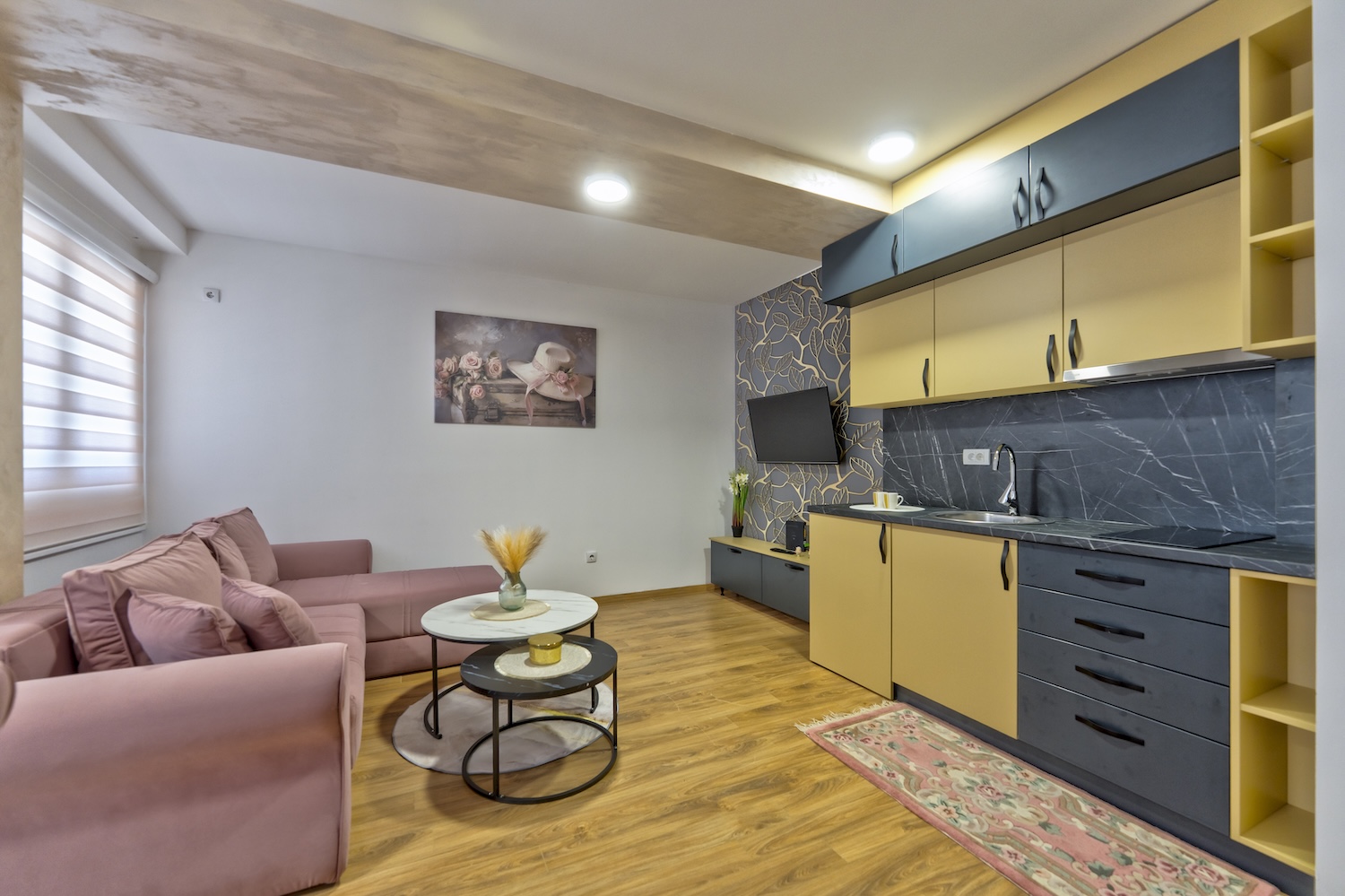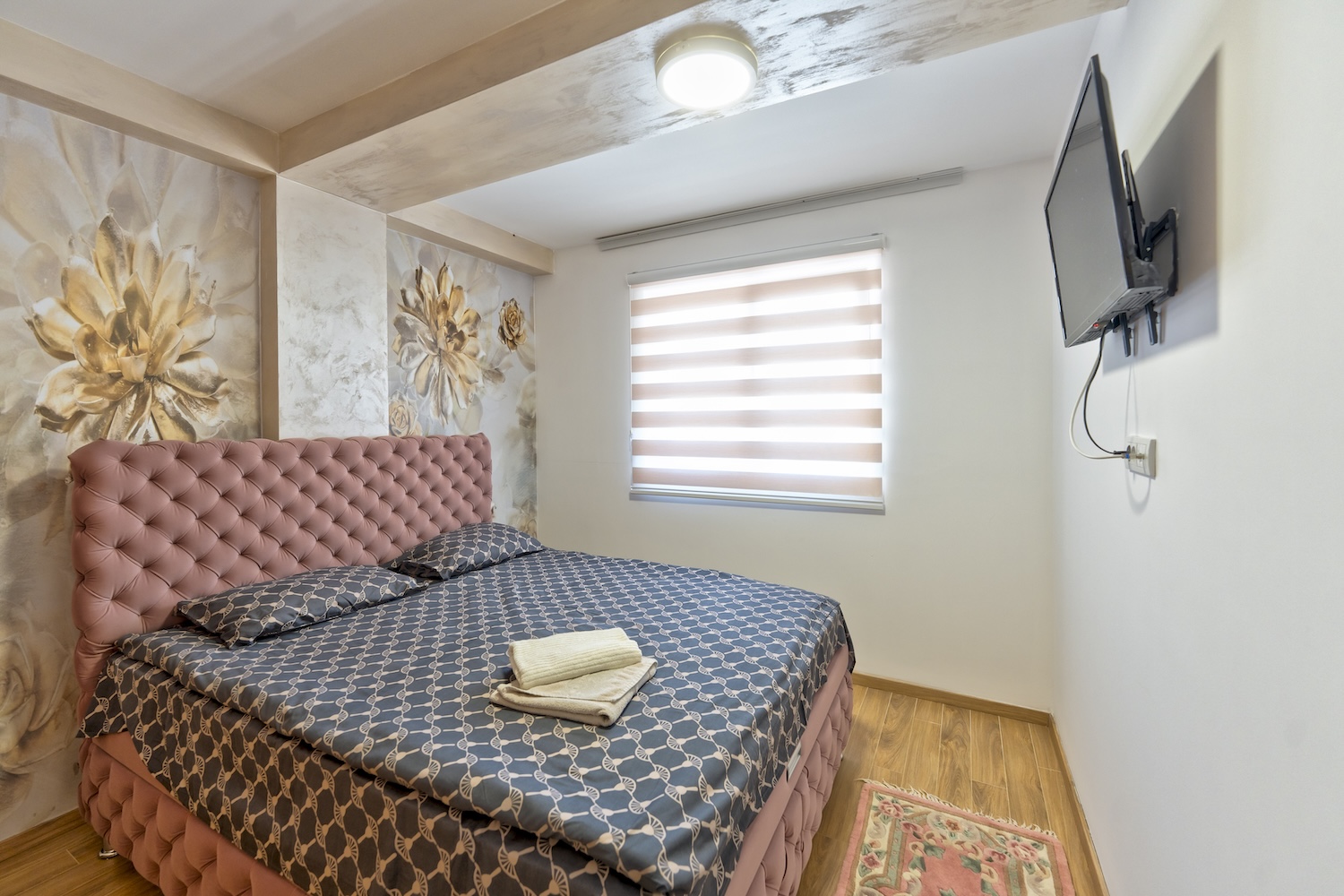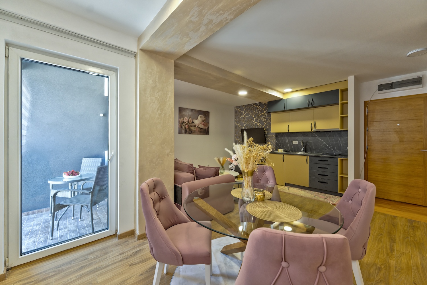 Apartman je luksuzno opremljen i potpuno nov, ima zasebnu spavaću sobu i veličine je 45m2, terasu sa predivnim pogledom, poseduje internet konekciju, kao i kablovsku TV. Pogodan je za smeštaj do 4 osobe. Kuhinja je potpuno opremljena. Gostima su obezbeđeni peškiri i posteljina.